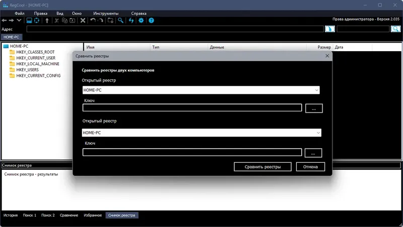 - Возможность сравнения двух реестров и поиска различий