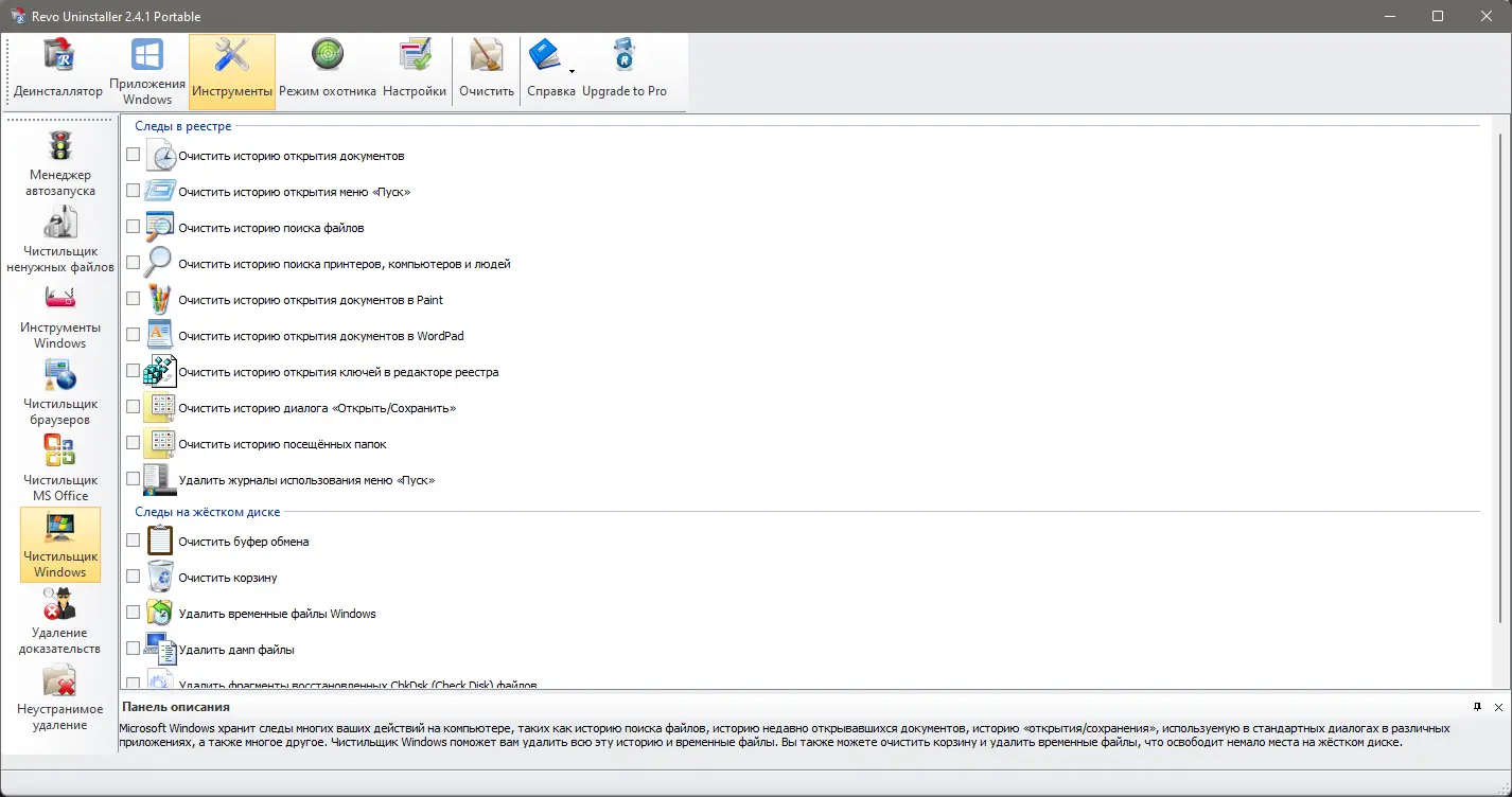 Revo Uninstaller — это профессиональный софт для удаления программ, который превосходит встроенные средства Windows по скорости и эффективности. Он использует продвинутый алгоритм сканирования системы до и после установки для выявления и удаления всех остатков удаляемых приложений. В программу встроены такие функции, как просмотр деталей о всех установленных приложениях, управление автозапуском и очистка временных файлов. Также программа предлагает уникальный режим «Охотник», который позволяет легко деинсталлировать и управлять программами с помощью простых инструментов.