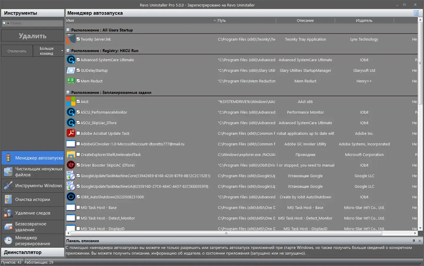Revo Uninstaller — это современное решение для полного удаления приложений, которое превосходит стандартные средства Windows. Программа использует уникальный алгоритм сканирования системы до и после установки, позволяя обнаружить и удалить все остаточные файлы, папки и записи в реестре. Также она обладает расширенными возможностями, такими как режим охотника, автоматическая очистка и управление автозагрузкой, что повышает эффективность работы системы и ускоряет её запуск. Бесплатная версия доступна для скачивания, а также есть профессиональный вариант с расширенными функциями, который можно скачать бесплатно на русском языке.