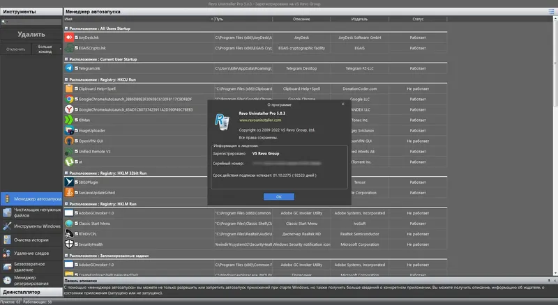 Revo Uninstaller — это мощное системное средство, предназначенное для эффективного удаления нежелательных программ с компьютера. Благодаря продвинутым алгоритмам сканирования и очистки, программа обеспечивает полное удаление приложений, оставляющих после себя файлы, папки и записи в реестре. В дополнение к стандартной деинсталляции Revo Uninstaller предлагает уникальные инструменты для управления автозагрузкой и очистки системы, что способствует повышению производительности и стабильности системы.