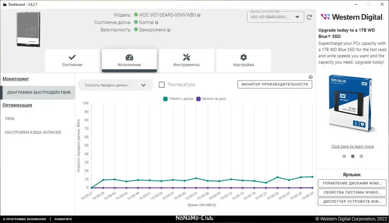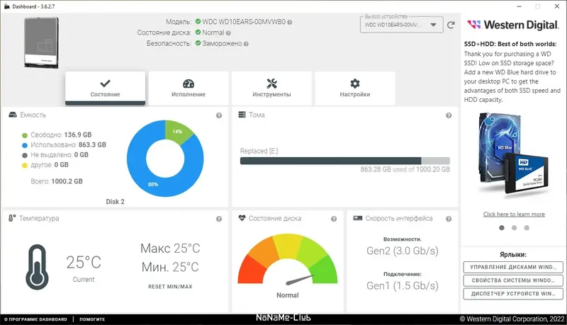 SanDisk SSD Dashboard — это мощный инструмент для тестирования и обслуживания твердотельных накопителей бренда SanDisk и WD. Программа отображает актуальную информацию о температуре, предполагаемом сроке службы и статусе диска, а также позволяет отслеживать производительность в реальном времени. Благодаря удобному интерфейсу и широкому функционалу, утилита подходит как для начинающих, так и для профессиональных пользователей, желающих обеспечить стабильную работу своих SSD. В числе ключевых возможностей — проведение тестов S.M.A.R.T., управление функциями TRIM и обновление прошивки, что способствует продлению срока службы накопителя и повышению его скорости.