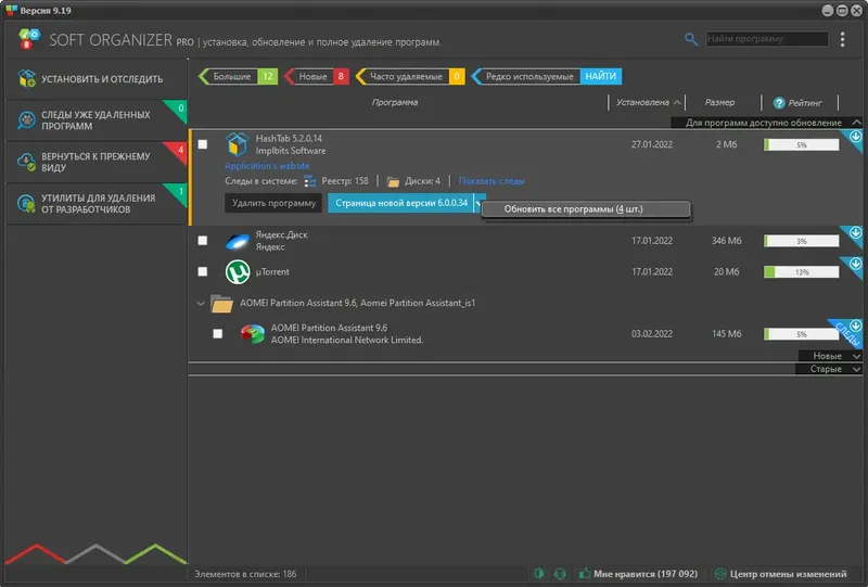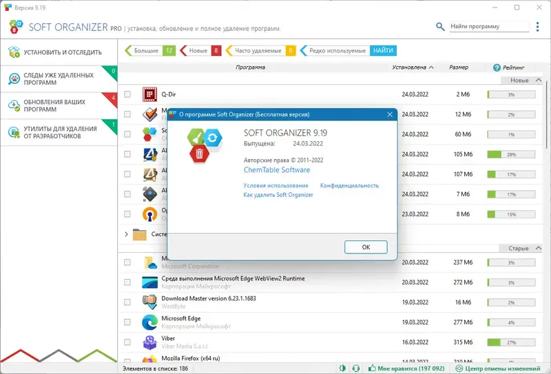 Soft Organizer — это мощная системная утилита для полной деинсталляции программ и очистки системы от остатков. Она помогает избавиться от ненужных файлов, записей в реестре и папок, которые остаются после обычного удаления приложений. Благодаря уникальной технологии отслеживания изменений, программа обеспечивает полноценное удаление, что делает её незаменимой для пользователей, заботящихся о чистоте и скорости работы системы.