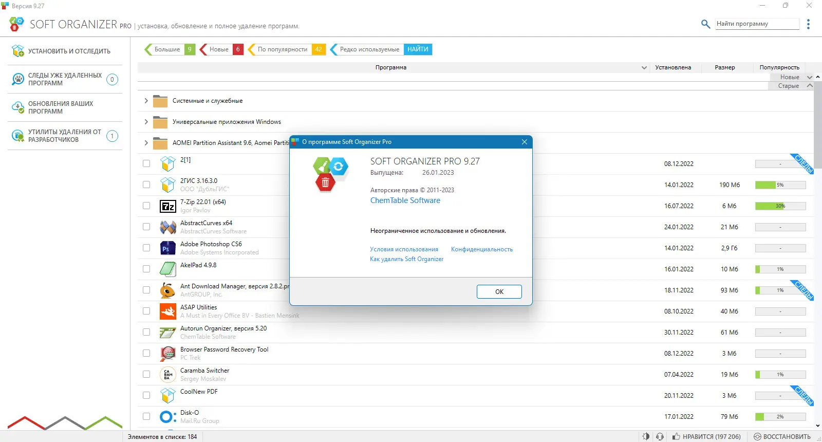 Soft Organizer — это мощная системная утилита, предназначенная для полного удаления программного обеспечения с компьютера. Она позволяет избавиться от остатков удалённых приложений, таких как файлы, папки и записи реестра, что помогает повысить производительность и стабильность системы. Благодаря встроенной функции отслеживания изменений во время установки, Soft Organizer обеспечивает максимально чистое и безопасное удаление программных продуктов.