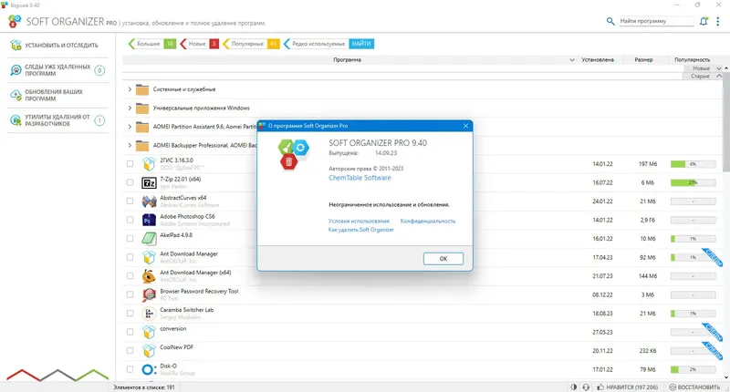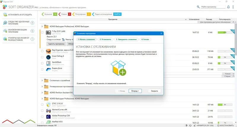Soft Organizer — это мощная системная утилита для полной деинсталляции программ и очистки системы от их остатков. Она помогает избавиться от ненужных файлов, записей в реестре и папок, которые часто остаются после стандартного удаления. Благодаря уникальной технологии отслеживания изменений, Soft Organizer обеспечивает максимально чистое удаление приложений, что положительно сказывается на производительности и стабильности системы.