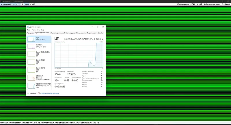 StressMyPC — это миниатюрная утилита для проведения стресс-тестирования компьютера в экстремальных условиях. Она позволяет проверить устойчивость системы, а также определить, сколько времени батарея ноутбука способна держать заряд при интенсивной нагрузке. Программа подходит как для тестирования стабильности разогнанных компонентов, так и для оценки работоспособности жестких дисков и графической карты.