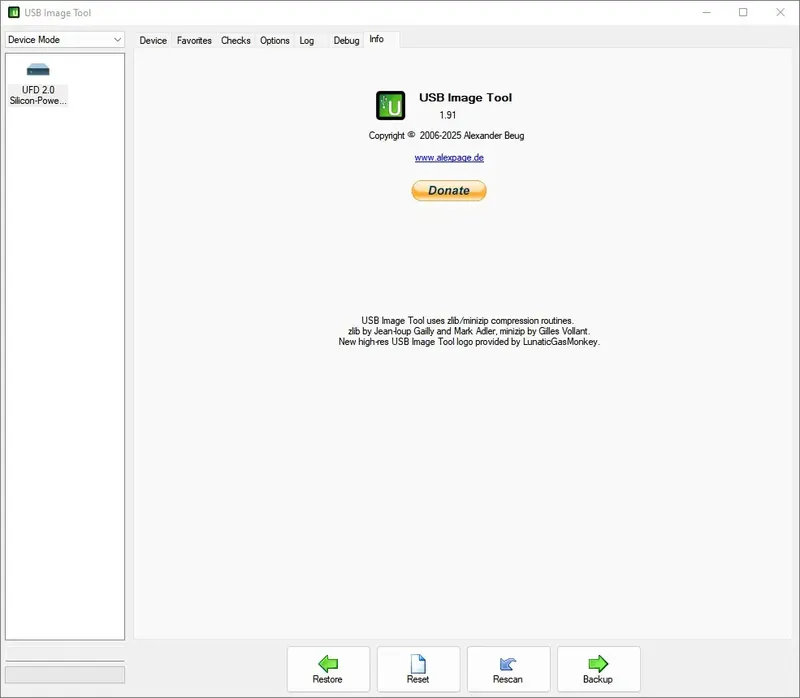 USB Image Tool — это легкая и надежная система резервного копирования данных с USB-устройств. В основе программы лежит технология посекторного копирования, которая позволяет создавать точные образы флешек и других USB-устройств в форматах IMG и IMA, а также сжимать их в ZIP-архивы для экономии места. Утилита обладает возможностью восстановления данных из созданных образов, а также переформатирования устройств для устранения проблем с отображением объема или совместимостью. Благодаря поддержке командной строки, программа идеально подходит для автоматизации процессов резервного копирования и восстановления. В интерфейсе есть краткая информация о подключенных устройствах, что облегчает управление несколькими накопителями одновременно.