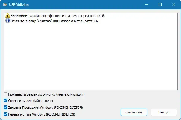 USB Oblivion — это портативная утилита, предназначенная для безопасного удаления следов подключения USB-устройств, таких как флешки, внешние диски и оптические носители, из регистра Windows. Программа помогает предотвратить возможные проблемы с безопасностью и конфиденциальностью, полностью очищая историю подключений. Благодаря автоматическому режиму и тестовому режиму работы, она подходит как для опытных пользователей, так и для тех, кто впервые сталкивается с подобными задачами.