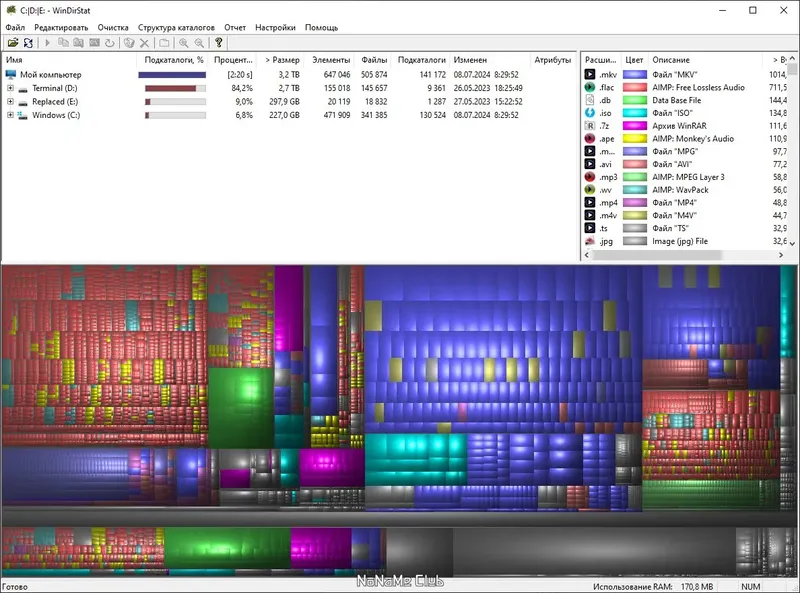 WinDirStat — это небольшая, но мощная системная утилита, которая предоставляет подробную статистику о содержимом дисков. Программа отображает структуру файлов и папок в виде цветных прямоугольников, площадь которых пропорциональна размеру файла или каталога. Благодаря этому можно легко определить, какие файлы занимают больше всего места и быстро принять меры по их удалению или перемещению. WinDirStat доступна для скачивания бесплатно и идеально подходит для пользователей, желающих разобраться в содержимом своего жесткого диска или SSD.