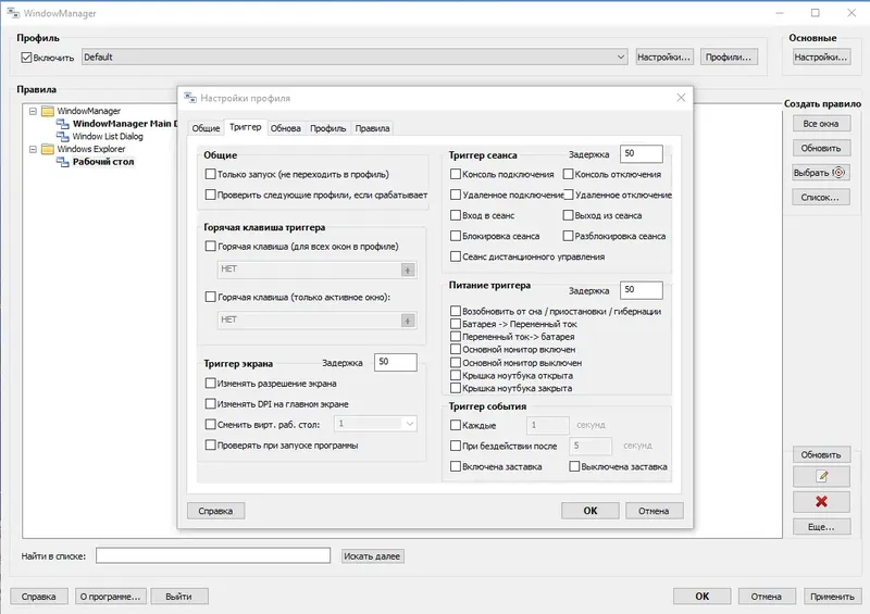 - Возможность сворачивания окон в трей и автоматического переключения профилей при событиях