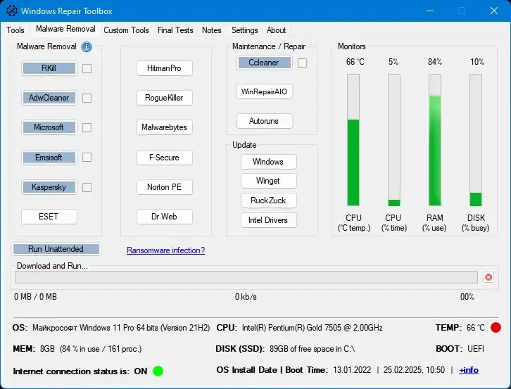 Repair Toolbox — это мощный инструмент, объединяющий в себе множество функций для системного обслуживания. Он подходит как для профессиональных специалистов, так и для домашних пользователей, желающих поддерживать свою Windows в исправном состоянии. Благодаря автоматической загрузке актуальных версий утилит, программа обеспечивает надежность и актуальность инструментов, что значительно ускоряет процесс устранения неполадок.