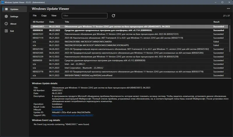 Update Viewer — это удобное средство для просмотра информации об обновлениях Windows. Программа использует API Центра обновления Windows и журналы событий системы, чтобы показывать сведения о установленных обновлениях, их номерах и статусе. Она позволяет легко получать детальную информацию о каждом обновлении и управлять отображаемыми данными, что делает её полезным инструментом для системных администраторов и пользователей, желающих контролировать обновления ОС.