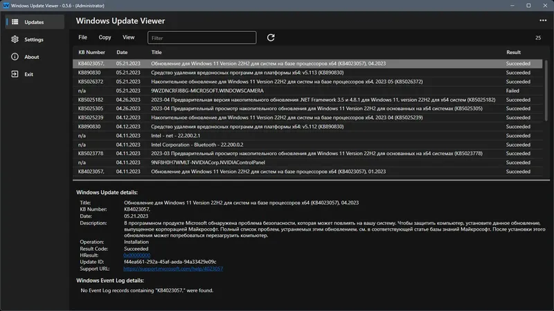 Update Viewer — это удобное приложение для просмотра информации об обновлениях Windows. Оно позволяет быстро получить сведения о установленных обновлениях, используя встроенные API и журналы событий системы. Эта утилита подходит для системных администраторов и пользователей, желающих контролировать процессы обновления и диагностировать возможные проблемы с Windows.
