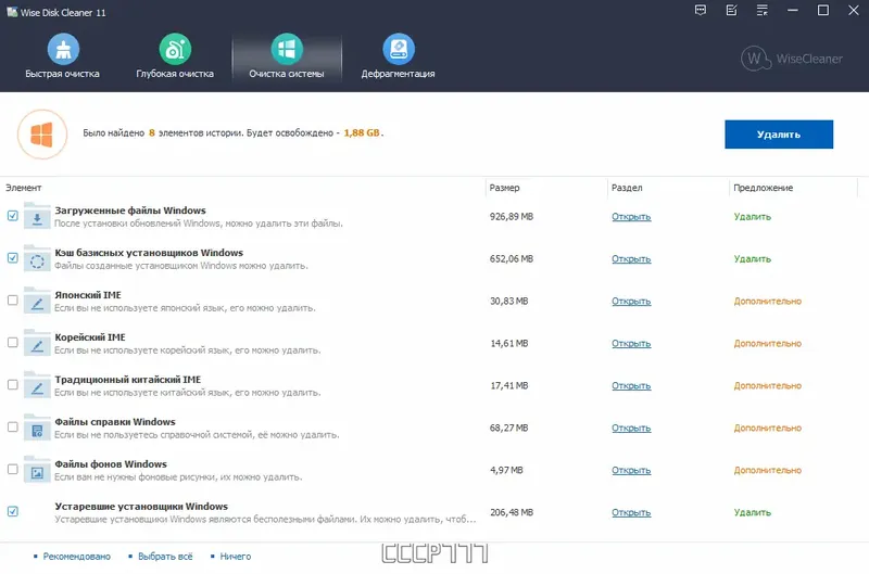 Эффективное восстановление свободного пространства и повышение скорости работы системы — основные преимущества Wise Disk Cleaner.