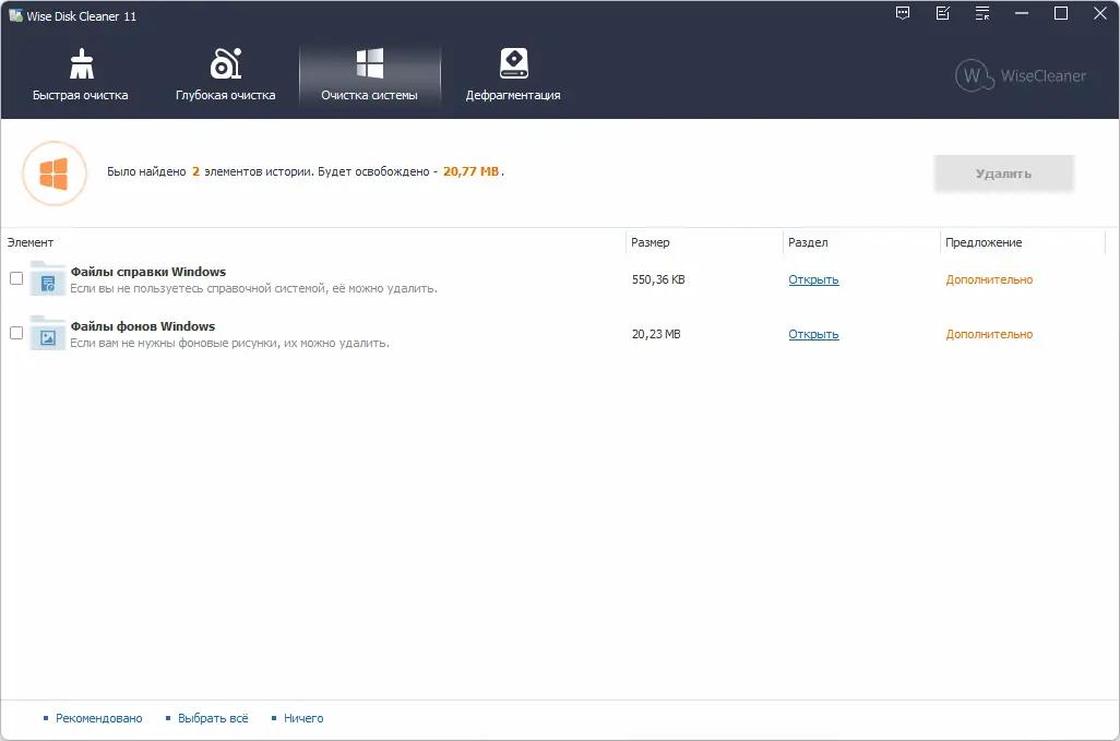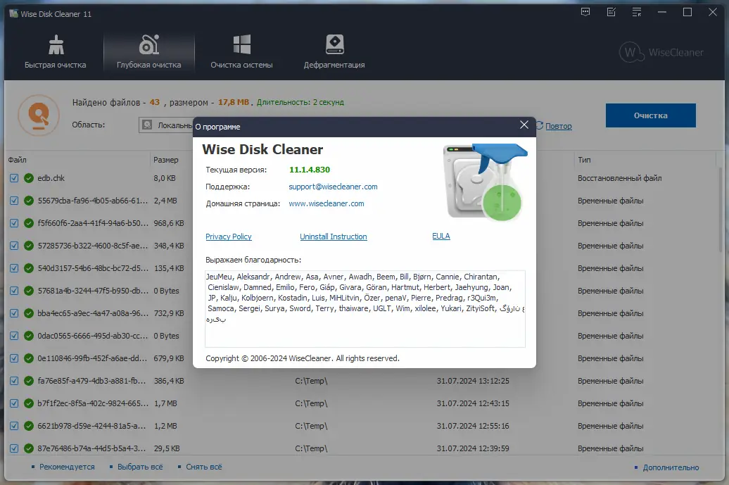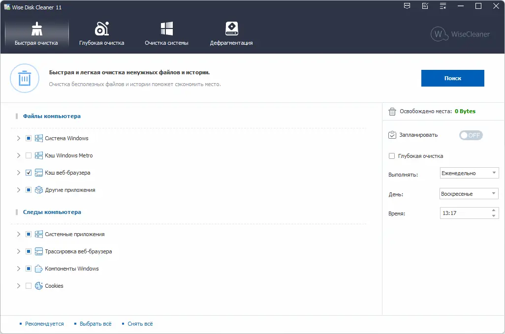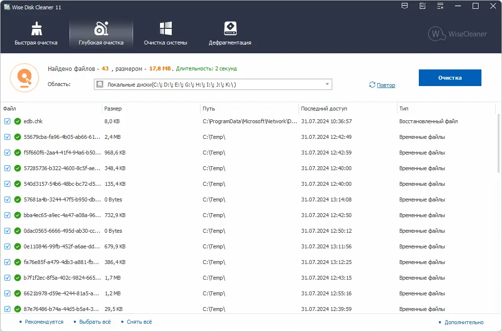 Wise Disk Cleaner — это эффективное решение для очистки жесткого диска, которое определяет более 50 типов мусорных файлов, включая временные файлы, кэш браузеров, ненужные системные файлы и другие. Благодаря автоматическому сканированию и возможности ручного добавления новых форматов, программа обеспечивает тщательную очистку системы. После анализа пользователь может просмотреть подробные отчеты и решить, что именно удалить, чтобы повысить скорость работы ПК и освободить место на диске.