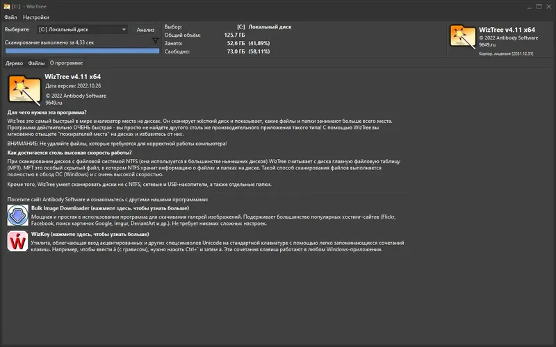 WizTree помогает быстро определить, как очистить диск и освободить место на жестком диске, что особенно важно при ограниченных ресурсах системы.