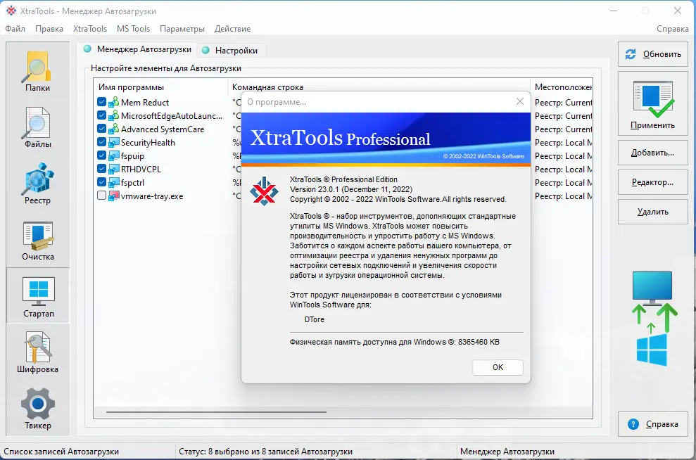 XtraTools — это универсальный профессиональный инструмент для оптимизации и настройки системы Windows. Он заботится о каждом аспекте работы компьютера, обеспечивая быстрый запуск, стабильность и безопасность. Встроенные модули позволяют управлять автозагрузкой, очищать реестр, ускорять работу жесткого диска и повышать эффективность использования оперативной памяти. Этот компактный и удобный в использовании софт дает полный контроль над системными настройками и позволяет добиться максимальной производительности.