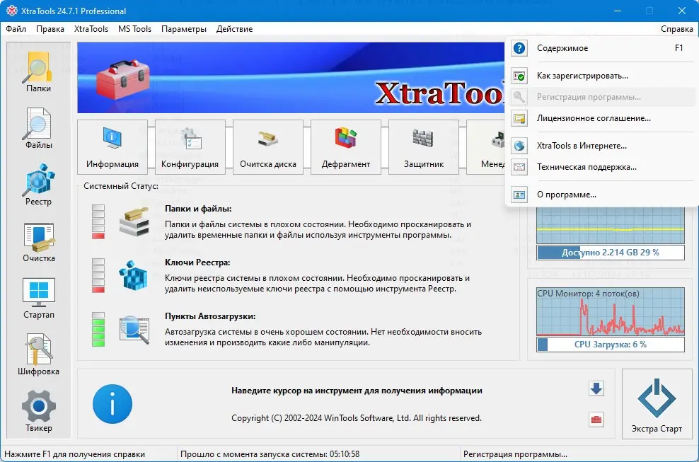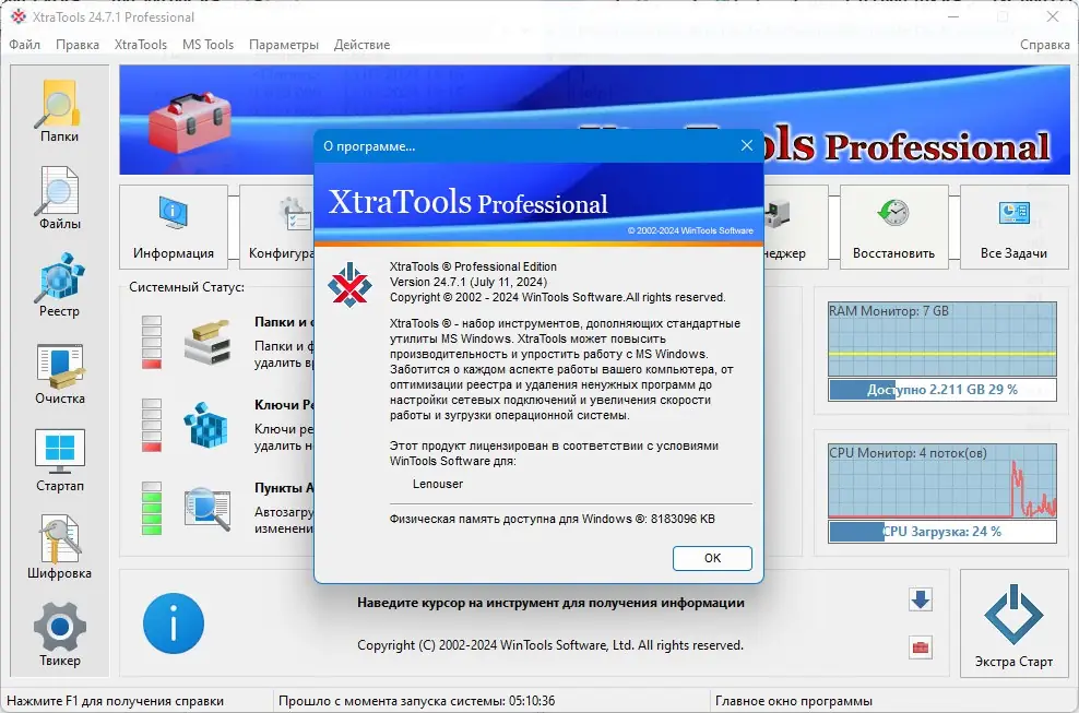 XtraTools — это мощный и универсальный набор системных утилит для оптимизации работы операционной системы MS Windows. Программа помогает повысить скорость и стабильность системы, очищая реестр, удаляя ненужные файлы и программы, а также настраивая сетевые подключения для более эффективной работы оперативной памяти. Благодаря интуитивно понятному интерфейсу и широкому функционалу, XtraTools предоставляет пользователю полный контроль над системными настройками, обеспечивая комфортное и безопасное использование ПК.