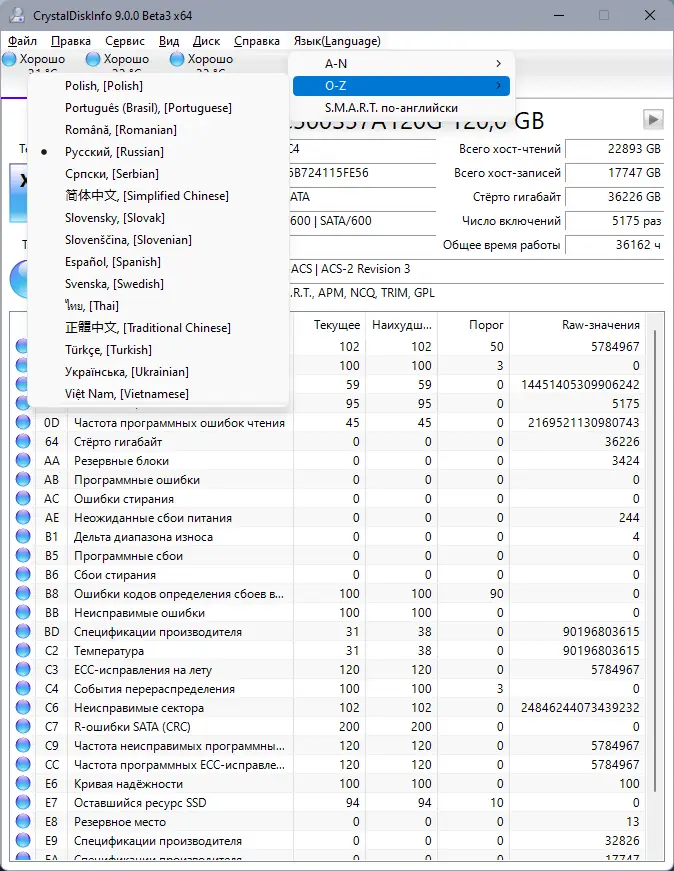 - Анализ атрибутов S.M.A.R.T., включая ошибки чтения и циклы включения