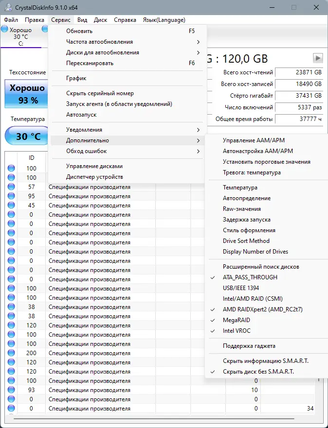Для проверки состояния диска необходимо скачать и запустить программу. После запуска она автоматически определяет все подключенные накопители и отображает их параметры. В основном окне доступны показатели здоровья диска, температура, а также параметры S.M.A.R.T., такие как количество ошибок чтения или циклов включения. В случае возникновения проблем программа предупредит пользователя, что позволяет предпринять необходимые меры. Также есть возможность управлять настройками внешних устройств и просматривать подробную информацию о SSD или HDD, что делает работу с программой максимально удобной и информативной.
