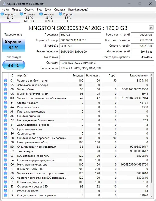 CrystalDiskInfo — это официальный и бесплатный софт, предназначенный для оценки состояния жестких дисков и SSD. Он предоставляет расширенную информацию о каждом накопителе, включая прошивку, серийный номер, тип интерфейса, общее время работы и параметры системы самодиагностики S.M.A.R.T. Пользователи могут легко проверить здоровье своих устройств, определить возможные неисправности и предотвратить потерю данных. Программа поддерживает сменные темы, локализации на русском языке и динамическое отслеживание изменений параметров, что делает её удобной для использования как новичками, так и профессионалами.