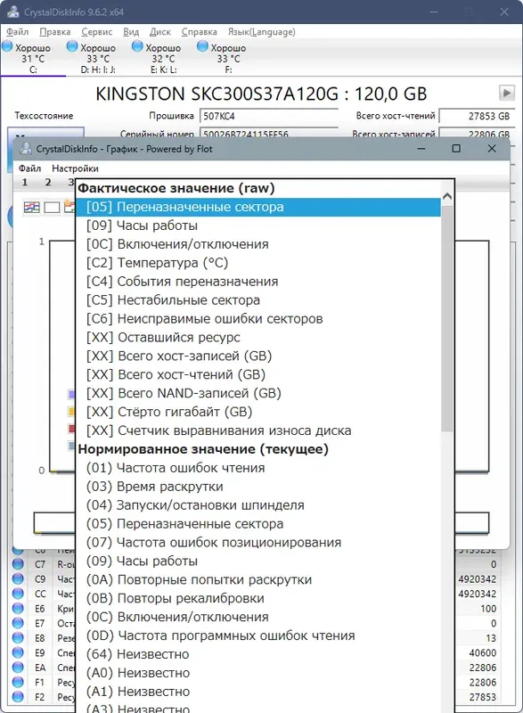 - Показ атрибутов S.M.A.R.T., таких как ошибки чтения и количество циклов перезапуска