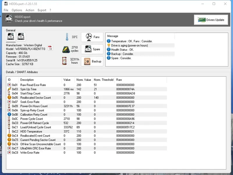 HDDExpert дает вам кристально четкое представление о состоянии вашего жесткого диска, анализируя показатели S.M.A.R.T. и переводя их в понятную индикацию. Программа позволяет отслеживать ключевые параметры, такие как температура, количество ошибок, скорость чтения и записи, а также другие важные атрибуты, влияющие на производительность и надежность диска. Благодаря удобному интерфейсу и понятной расшифровке данных, пользователь получает возможность быстро оценить текущий уровень износа и принять меры для профилактики возможных сбоев.