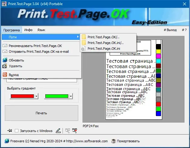 Для использования программы достаточно скачать портативную версию и запустить файл. После запуска откроется интерфейс с несколькими опциями, среди которых можно выбрать тестовую страницу или настроить градиенты для проверки цветопередачи. В меню доступны функции для распечатки цветовых палитр Windows, а также возможность настройки параметров для повышения качества печати и устранения ошибок. Все операции выполняются быстро и без необходимости в специальных знаниях или настройках.
