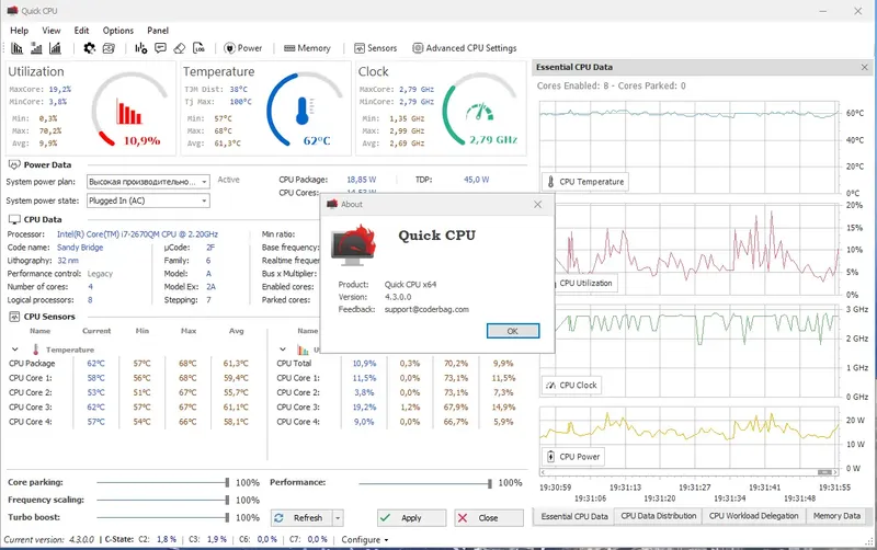 QuickCPU — это универсальное решение для настройки и контроля работы процессора, которое предоставляет пользователям инструменты для изменения частот, управления режимами энергосбережения и мониторинга температуры в реальном времени. Программа поддерживает широкий спектр функций, включая регулировку Turbo Boost, управление C-States, Speed Shift и FIVR Контроль, что делает ее незаменимым помощником для тех, кто стремится повысить производительность и стабильность системы. На сайте coderbag com product представлено множество вариантов загрузки, что позволяет легко скачать и установить программу на любой совместимый ПК.