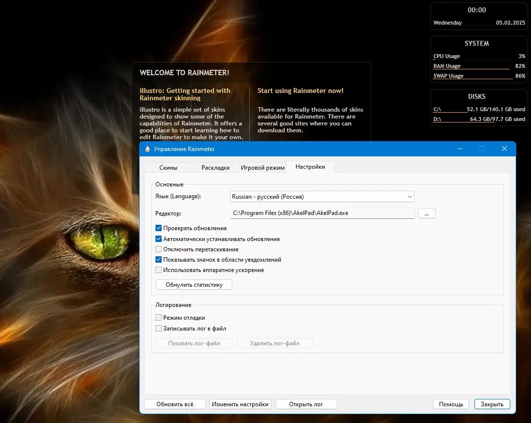 Rainmeter — это мощный инструмент для мониторинга ресурсов компьютера и оформления рабочего стола. Он позволяет отображать графики загрузки центрального процессора, объем свободной и занятой оперативной памяти, а также информацию о виртуальной памяти и дисках. Кроме того, программа умеет показывать сетевую активность, включая IP-адрес, трафик и скорость использования каналов связи. В дополнение можно вывести данные о погоде и новости, что делает интерфейс не только информативным, но и эстетичным. Визуальные элементы создаются с помощью скинов, которые можно легко скачивать и настраивать, обеспечивая индивидуальный стиль рабочего пространства.