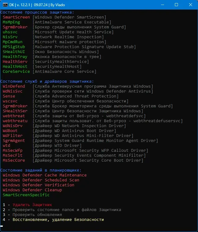 DefenderKiller — это мощный и удобный инструмент для администрирования защиты Windows. Он позволяет полностью отключать или восстанавливать Windows Defender и его компоненты, что особенно актуально при использовании сторонних антивирусных решений или необходимости временного отключения защиты для выполнения определённых задач. Программа обладает портативной версией, что делает её удобной для использования на различных устройствах без необходимости установки. Благодаря простому интерфейсу и высокой эффективности, DefenderKiller широко применяется системными администраторами и опытными пользователями для быстрого управления средствами защиты Windows.