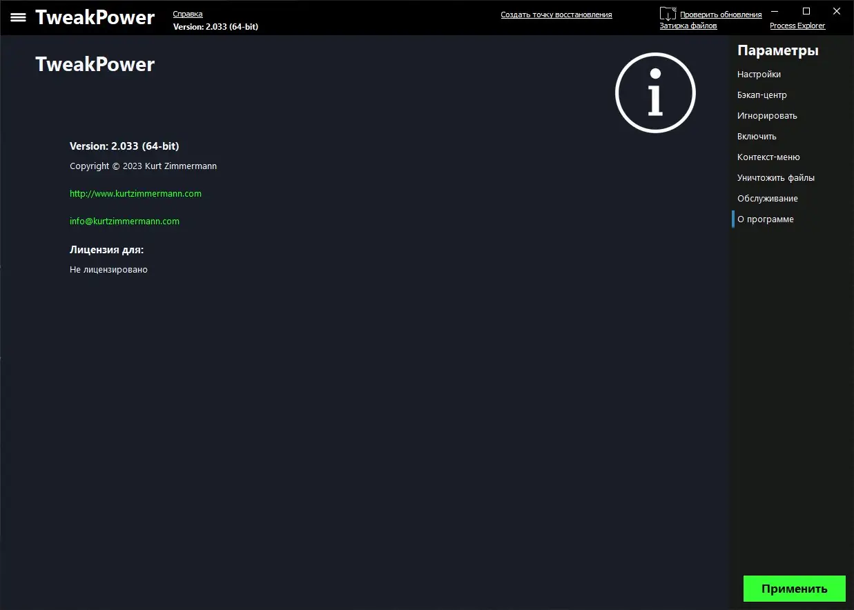 ТweakPower — это мощный и многофункциональный инструмент для оптимизации и настройки операционной системы Windows. В комплект входят средства для очистки мусора, удаления следов посещения интернет-страниц и исправления ошибок в реестре. Программа позволяет управлять автозагрузкой приложений, что способствует ускорению запуска системы и повышению её общей производительности. Также TweakPower включает функции для создания точек восстановления и резервного копирования, что обеспечивает безопасность данных при внесении изменений. Разработчики предусмотрели режим Турбо, который отключает более 70 фоновых процессов для быстродействия в критических ситуациях, а встроенный деинсталлятор помогает полностью удалять нежелательные программы. В дополнение к этому, программа включает инструменты для дефрагментации дисков, сплиттер файлов и управления системными настройками, что позволяет добиться максимальной скорости и стабильности работы системы.