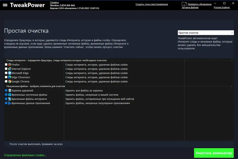 Твикеры для оптимизации системы позволяют значительно повысить её производительность, ускорить работу и обеспечить стабильную работу Windows. TweakPower — универсальный инструмент, объединяющий множество функций для очистки, настройки и оптимизации компьютера. Благодаря простому графическому интерфейсу программа подходит как для опытных пользователей, так и для новичков, желающих максимально эффективно настроить систему без глубоких знаний в области IT.