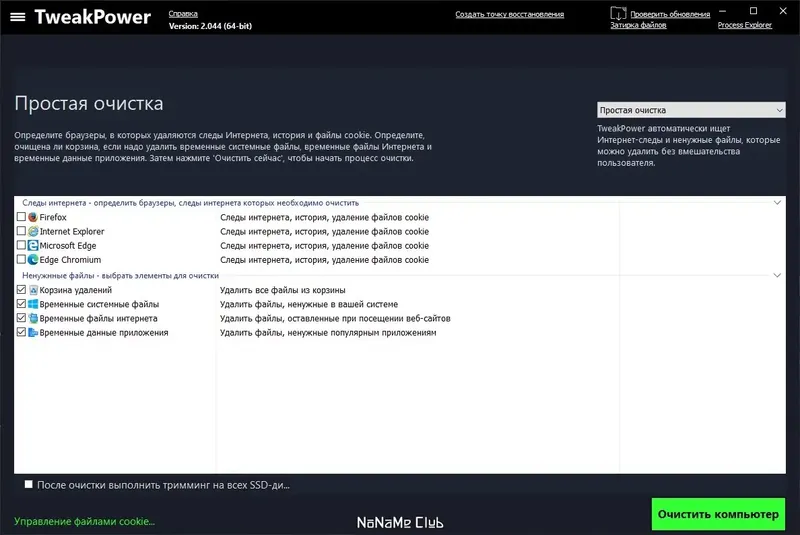 Основная задача TweakPower — обеспечить полноценную настройку и оптимизацию операционной системы Windows. Встроенные средства позволяют очищать временные файлы, следы посещения сайтов, а также управлять автозагрузкой и запуском приложений. Программа подходит как для опытных пользователей, так и для новичков, желающих повысить быстродействие компьютера и повысить безопасность системы.