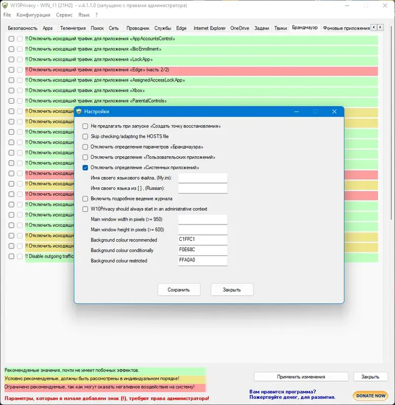 W10Privacy — это универсальный инструмент, предназначенный для изменения настроек системы Windows с целью повышения уровня конфиденциальности и защиты личных данных. Он предоставляет пользователю возможность самостоятельно выбрать, какие параметры следует активировать или отключить, избегая автоматических и потенциально опасных изменений. Программа разбита на 12 разделов, каждый из которых содержит конкретные настройки, связанные с безопасностью, приватностью, системными службами и интеграцией с облачными сервисами. Важной особенностью является визуальное отображение влияния каждого параметра на работоспособность системы с помощью цветовой маркировки — зеленый, желтый и красный, что облегчает принятие решений. Также при наведении курсора появляется подсказка с подробным описанием функции, что делает использование программы интуитивно понятным даже для новичков.
