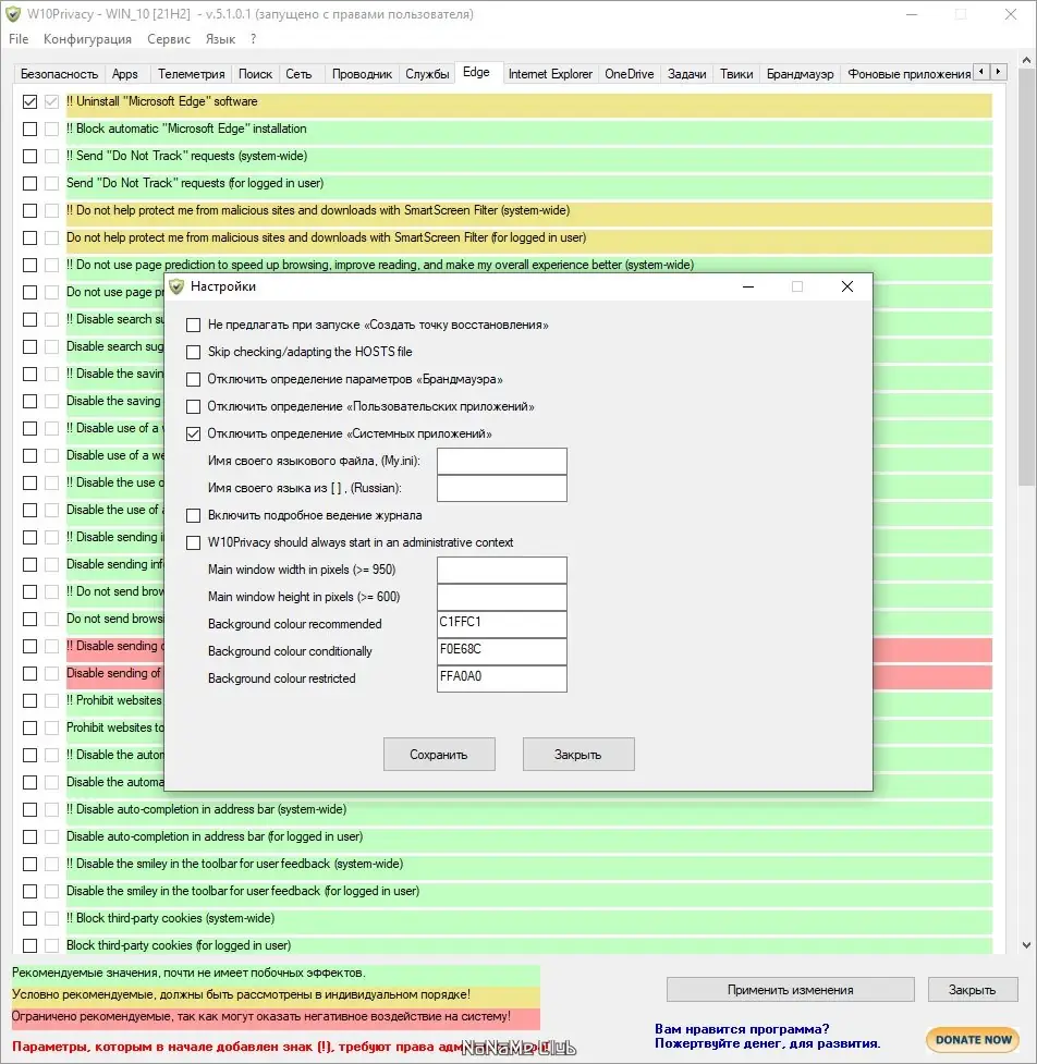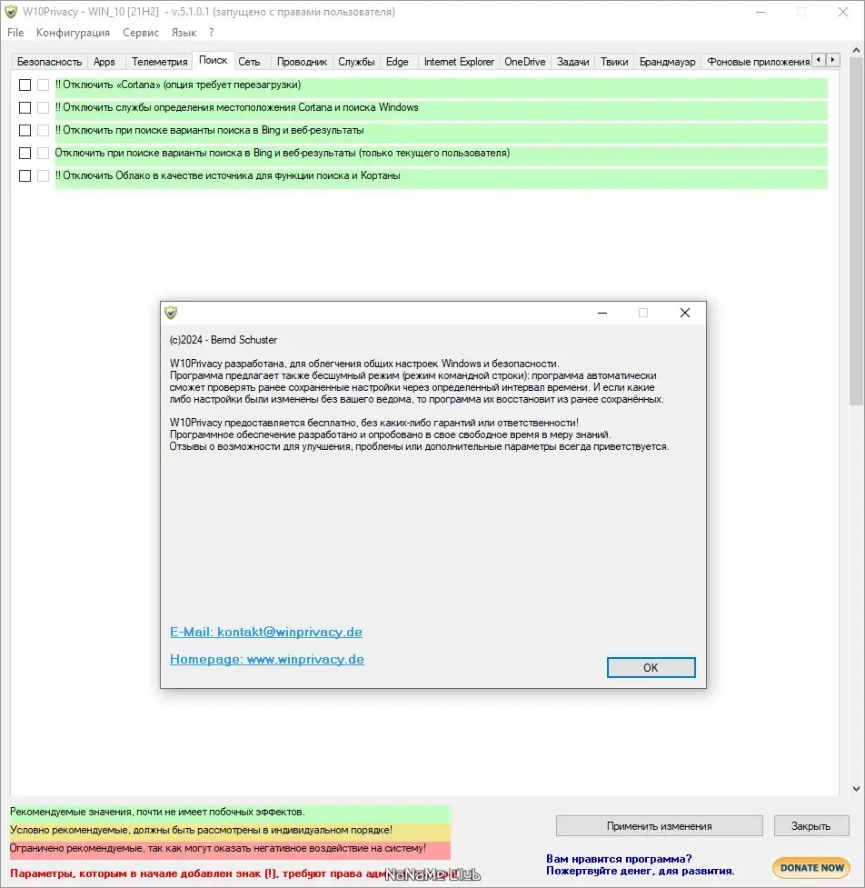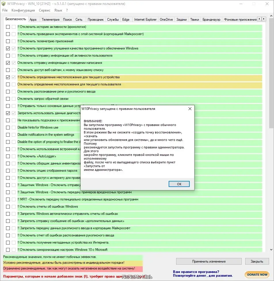 Для использования W10Privacy необходимо запустить программу и ознакомиться с разделами, разделёнными по категориям. Пользователю предлагается просмотреть список настроек, выделенных цветом, и самостоятельно выбрать, какие параметры следует включить или отключить. В каждом разделе предусмотрены всплывающие подсказки с подробным описанием функции, что помогает принимать обоснованные решения. После внесения изменений рекомендуется перезагрузить систему для применения настроек. Перед началом рекомендуется создать точку восстановления, поскольку программа не создает её автоматически. В случае необходимости, можно скачать портативную версию, выбрав соответствующий режим установки, что удобно для переносных устройств.