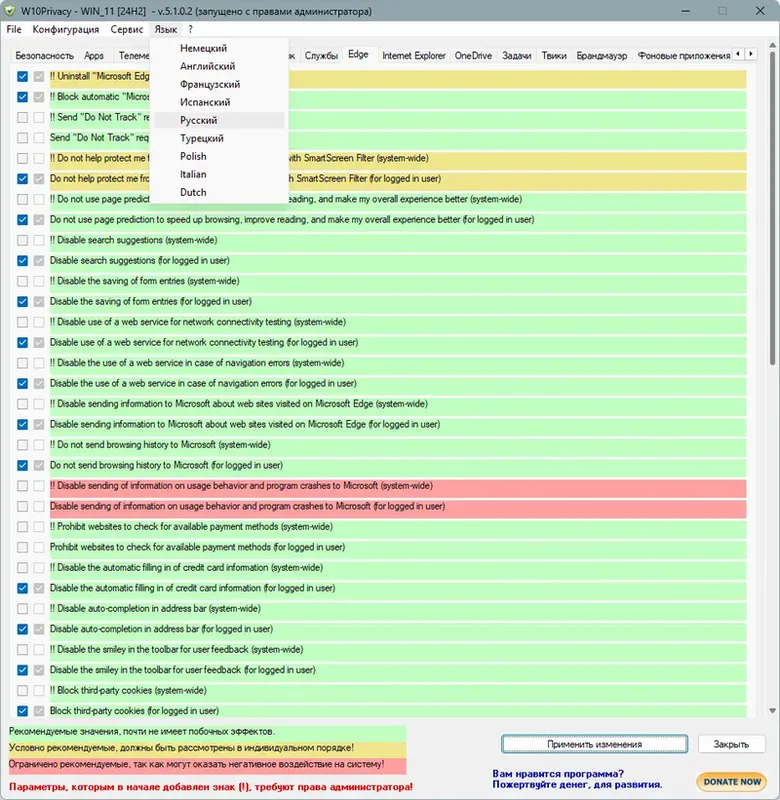 W10Privacy — это программа, которая позволяет изменять настройки системы Windows 10 для повышения уровня защиты и конфиденциальности. Она предоставляет пользователю возможность самостоятельно управлять параметрами, разделенными на 12 разделов, среди которых безопасность, приватность, службы и другие. Каждая настройка выделена цветом, что облегчает понимание влияния изменений на работоспособность операционной системы. Программа также поддерживается на Windows 11 и совместима с последними версиями ОС, обеспечивая стабильную работу и безопасность.