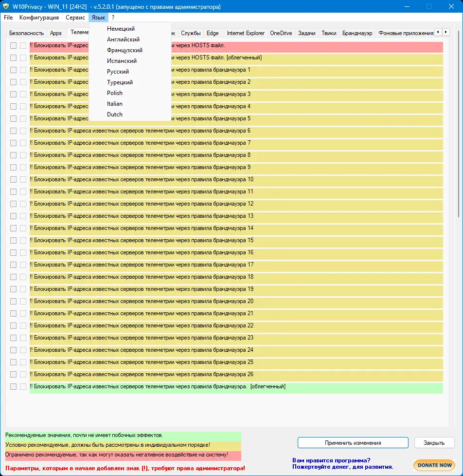 W10Privacy — это программа, предназначенная для изменения настроек Windows 10 с целью минимизации сбора данных и усиления защиты информации. Она позволяет пользователю легко управлять параметрами конфиденциальности, отключая лишние службы и функции, которые могут собирать личные данные. В интерфейсе программы все параметры разделены на 12 разделов и выделены цветом в зависимости от их влияния на стабильность системы и безопасность. Это делает процесс настройки понятным и безопасным, исключая риск случайного отключения важных компонентов системы. Кроме того, программа поддерживает Windows 11 и совместима с последними версиями операционной системы, что делает ее актуальной для современных устройств.