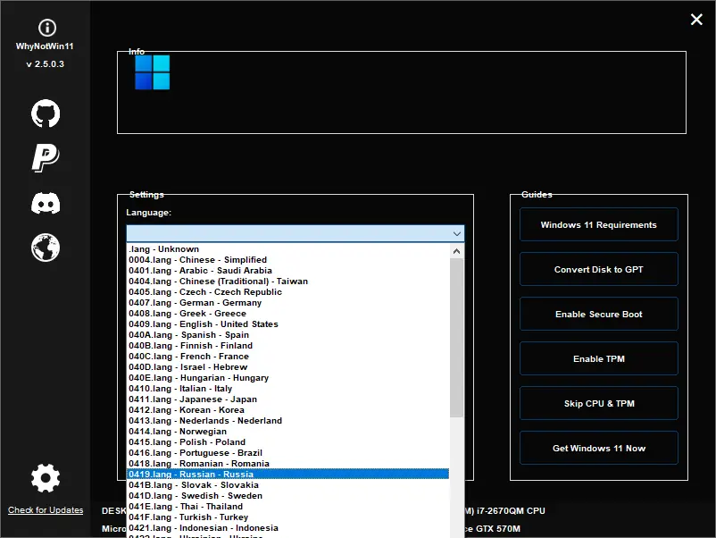 WhyNotWin11 — это современная утилита с открытым исходным кодом, которая помогает пользователям определить, подходит ли их компьютер для установки Windows 11. Программа проста в использовании и не требует специальных знаний. Она совместима с различными версиями Windows и предоставляет подробную информацию о состоянии аппаратных компонентов, таких как процессор, оперативная память, графика и системный диск.