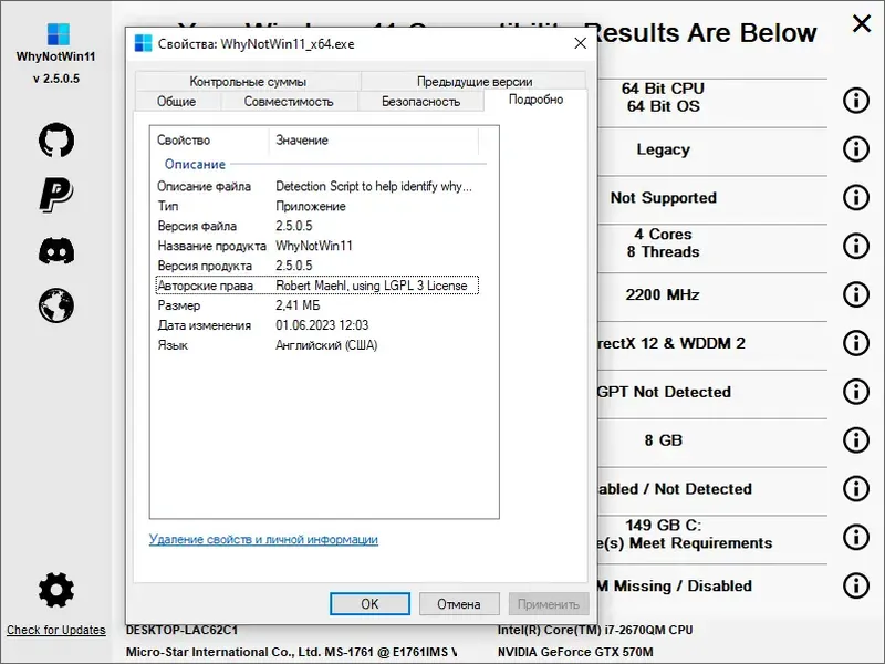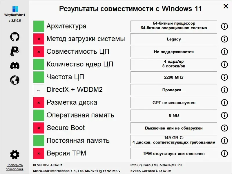 WhyNotWin11 позволяет определить, подходит ли ваш компьютер для обновления до Windows 11, что особенно важно для тех, кто планирует обновление системы или собирается купить новое устройство.