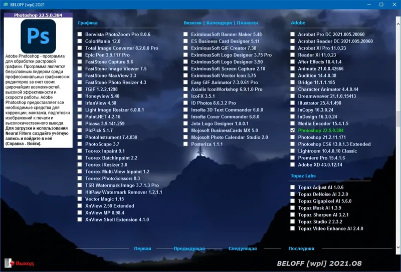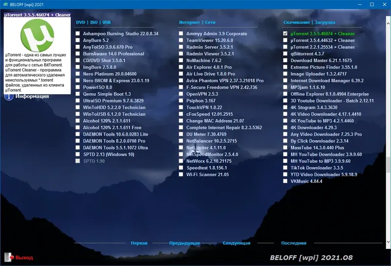 BELOFF — это универсальный сборник программ для операционных систем Windows, предназначенный для автоматической установки и удобного управления софтом. В сборнике представлены различные категории программ, включая портативные версии, что позволяет легко скачать, установить и использовать необходимые инструменты без лишних хлопот. Программа идеально подходит для тех, кто хочет быстро подготовить рабочий компьютер или обновить систему, сохраняя все нужные приложения и драйверы.
