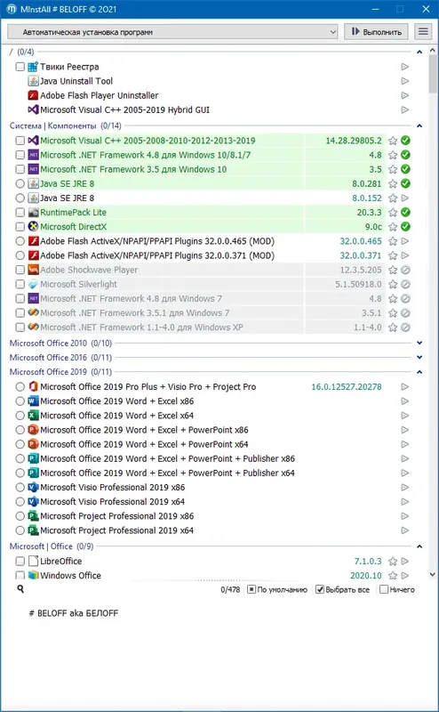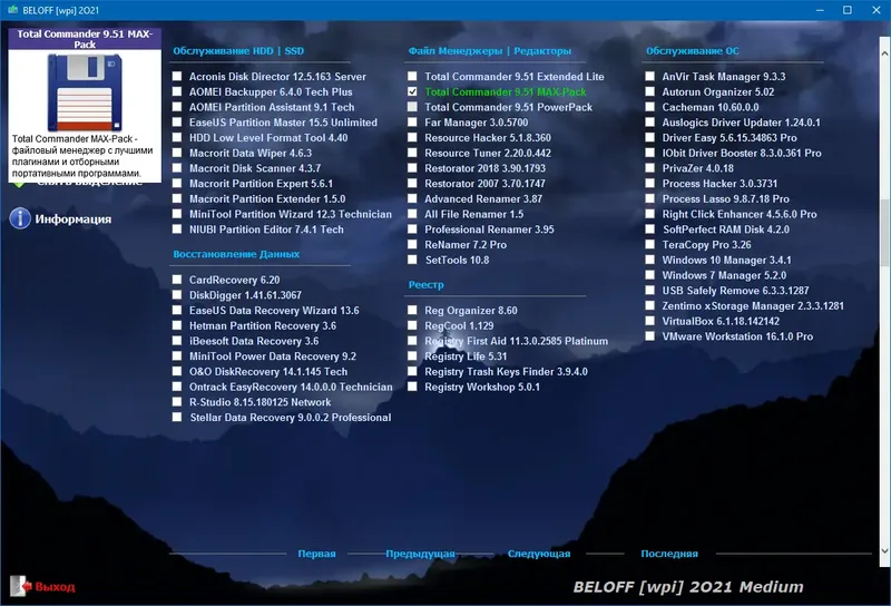 BELOFF — это универсальный сборник лучших программ для Windows с автоматической установкой и мультизагрузкой, предназначенный для быстрого и удобного оснащения компьютера необходимым софтом. В сборник входит множество программ, включая портативные версии, что позволяет использовать его с USB-накопителей или дисков без необходимости установки. Программа предоставляет возможность скачать, установить и обновить широкий спектр приложений, драйверов и утилит, значительно ускоряя подготовку системы.