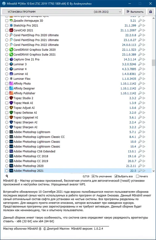 МInstAll — это современный сборник программного обеспечения, предназначенный для быстрого и удобного автоматического установки различных приложений на чистую систему. Обновленный 10 сентября 2021 года, он содержит последние версии популярных программ, зарегистрированные и готовые к использованию без активации. Этот мастер установки значительно упрощает процесс подготовки системы и подходит как начинающим, так и опытным пользователям. В сборнике представлен широкий спектр программ, охватывающих все основные категории — офисные, мультимедийные, графические, утилиты для работы с файлами и многое другое.