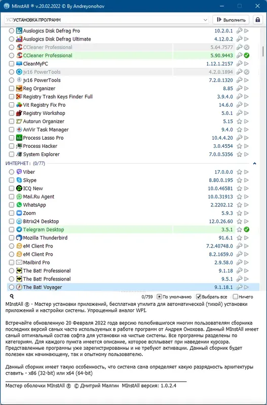 MInstAll — это современный мастер установки программного обеспечения, объединяющий в себе удобство и функциональность. Обновленная версия от 20 февраля 2022 года позволяет быстро и без проблем подготовить систему к работе с множеством популярных приложений. Этот сборник идеально подходит для тех, кто хочет автоматизировать процесс установки и избежать лишних хлопот при настройке системы.