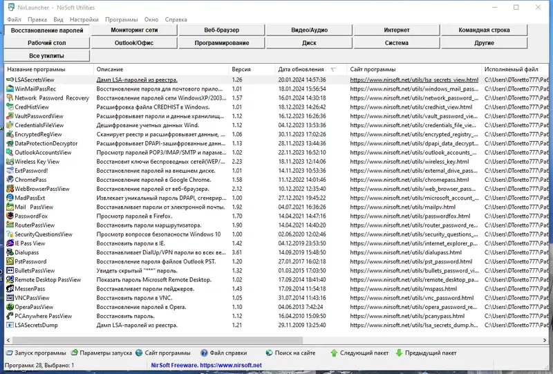 NirLauncher — это комплект небольших, портативных программ, объединенных в единый пакет для повышения эффективности работы на ПК. В него входит более 200 утилит, которые помогают редактировать контекстное меню, анализировать сеть, восстанавливать утерянные пароли, управлять файлами и браузерами. Благодаря автоматическому определению разрядности системы, программа подбирает и запускает соответствующую версию утилит для 32-х или 64-х битных систем. Такой package позволяет легко сортировать и искать нужные инструменты по различным критериям, что значительно ускоряет выполнение конкретных задач и повышает продуктивность работы.