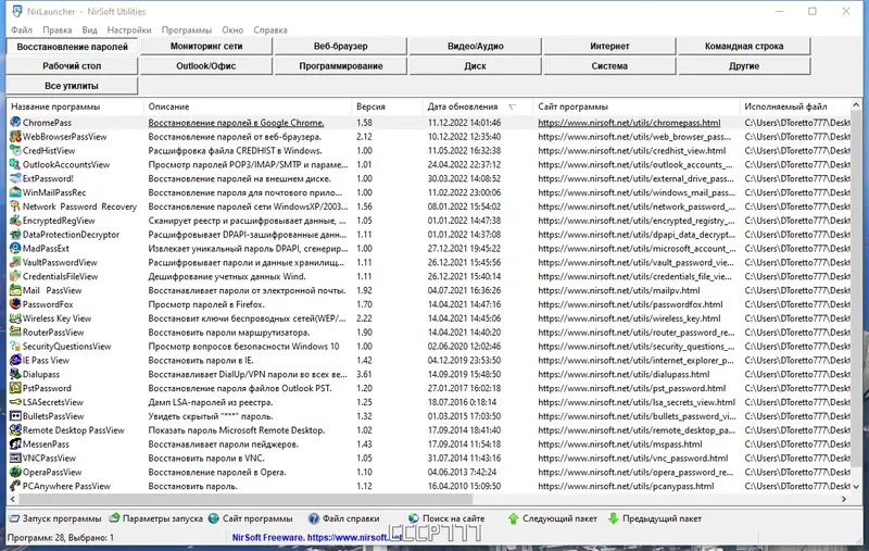 NirLauncher представляет собой сборник небольших, портативных утилит, которые можно запускать прямо из архива или с флешки. В пакет входит более 200 программ для редактирования контекстного меню проводника, работы с паролями, анализа системных файлов, управления шрифтами и многого другого. Удобная структура и сортировка позволяют легко находить необходимые инструменты по разным критериям, например, по дате обновления или названию. Благодаря автоматическому определению разрядности системы, NirLauncher работает как на 32-х, так и 64-х битных ОС, что расширяет его возможности и удобство использования.