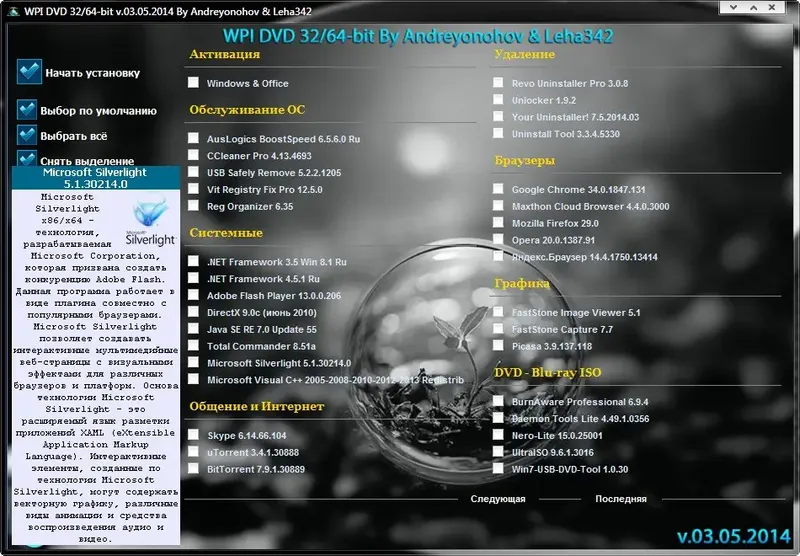 WPI DVD — это обновлённый сборник программного обеспечения, предназначенный для быстрой установки и обслуживания операционных систем Windows. В версии от 3 мая 2014 года собраны последние версии популярных приложений, что позволяет пользователям легко подготовить систему к работе или восстановить её. Такой комплект отлично подходит как для новичков, так и для опытных пользователей, обеспечивая максимальную автоматизацию и удобство в использовании. Программа автоматически определяет разрядность системы и подбирает подходящие версии программ, что значительно ускоряет процесс установки и минимизирует возможные ошибки.