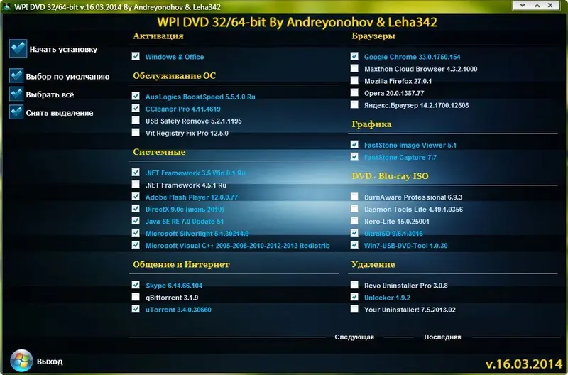 WPI DVD — это готовый сборник программного обеспечения, предназначенный для быстрого и удобного установки необходимых приложений на чистую систему. В обновлённой версии, выпущенной 16 марта 2014 года, собраны последние версии популярных программ для работы, интернета, мультимедиа и безопасности. Такой комплект подходит как начинающим пользователям, так и опытным специалистам, позволяя значительно сэкономить время на настройке и обновлении системы.
