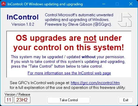 Для использования InControl достаточно скачать портативную версию программы, запустить её и ознакомиться с текущим состоянием обновлений. После запуска программа отображает статус контроля над обновлениями: сообщение о том, кто управляет обновлениями — пользователь или система. Чтобы взять контроль, нужно нажать кнопку «Take control», после чего система перестанет автоматически устанавливать обновления функций. Для изменения целевой версии Windows или отмены блокировки достаточно внести необходимые параметры в соответствующие поля. В любой момент можно вернуть автоматическое обновление, нажав кнопку «Release control». Простота интерфейса и минимальный набор действий делают программу доступной даже для неподготовленных пользователей и системных администраторов, заботящихся о стабильности своих систем.