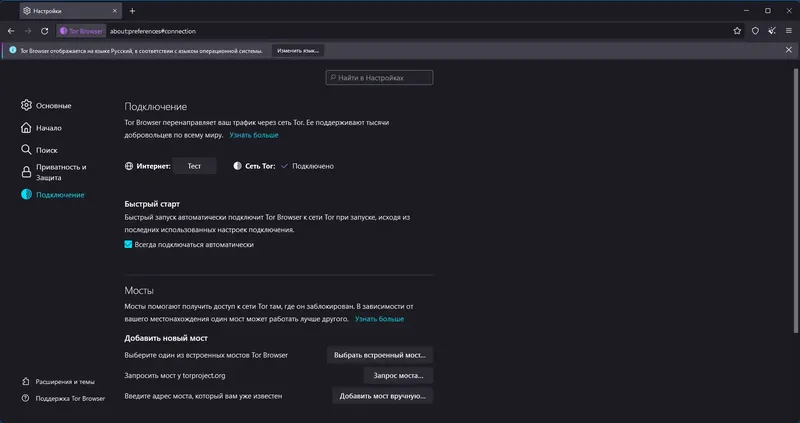 - Поддерживает работу с мостами для обхода блокировок сайтов.